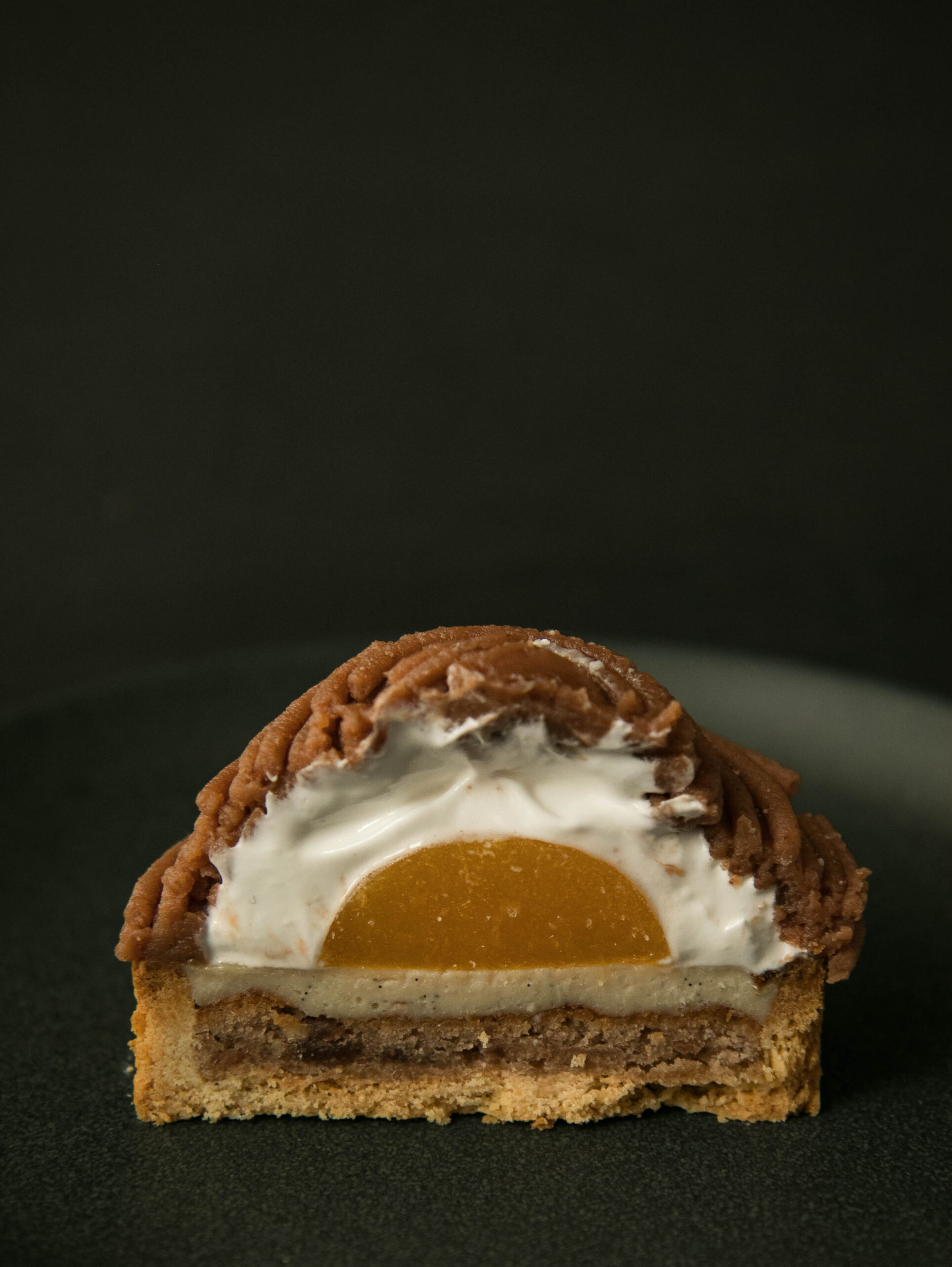 • Sobre la base de la tarta ya rellena con crema pastelera, colocar el inserto de compota de mandarina.